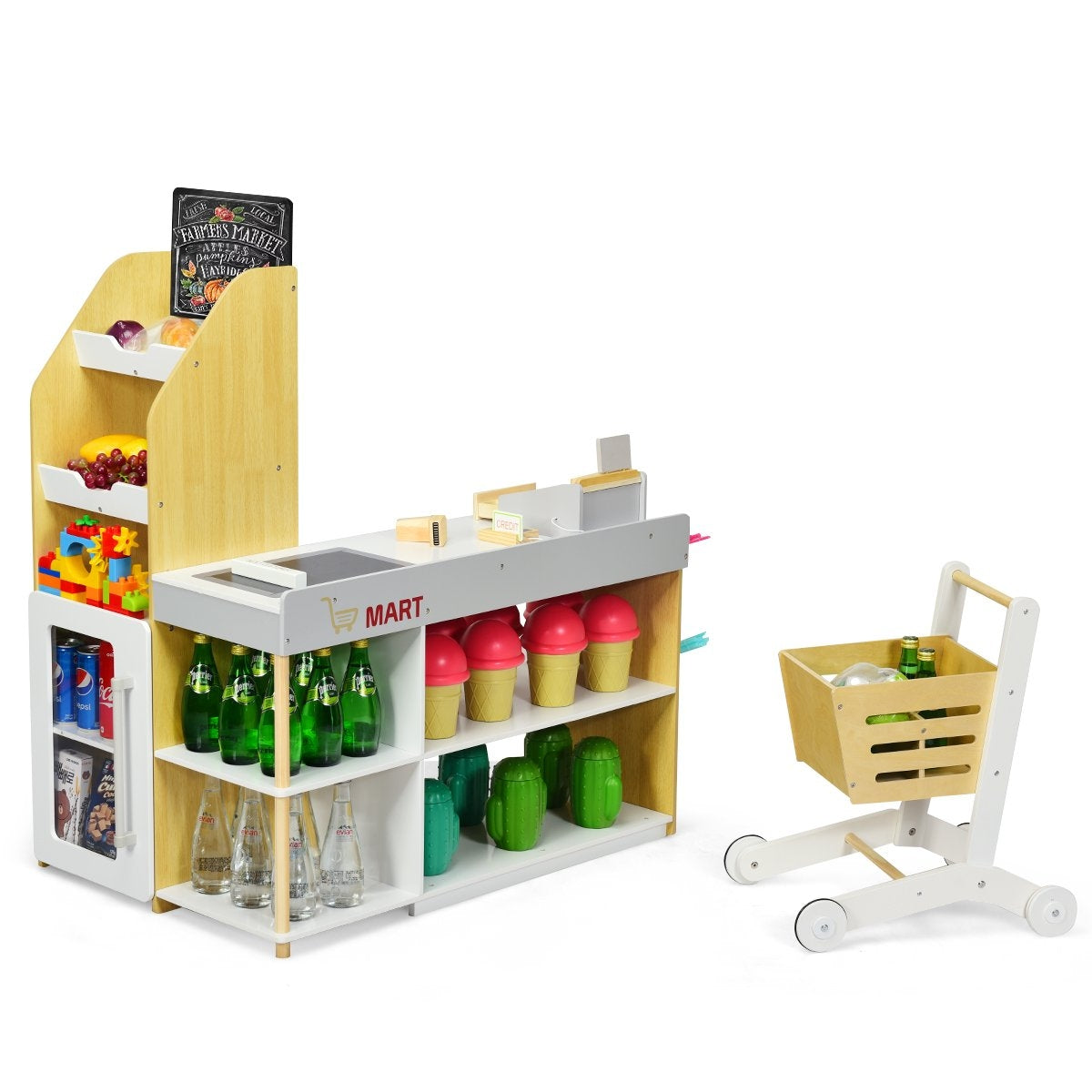 1x Carrito de compra, 1x Escáner, 1x Lector de tarjetas, 1x Tarjeta de crédito, 5x Monedas de madera
