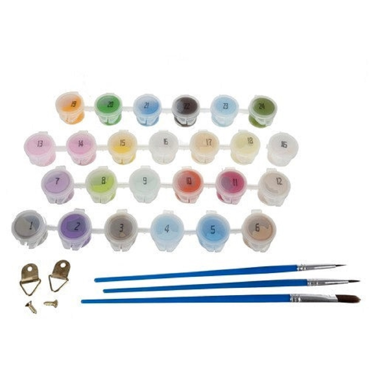 1x Lienzo Sobre Marco De Madera, 1x Juego De Pintura, 3x Pinceles, 1x Muestra De Imagen, 2x Ganchos Con Tornillos, 2x Ganchos Sin Rastro