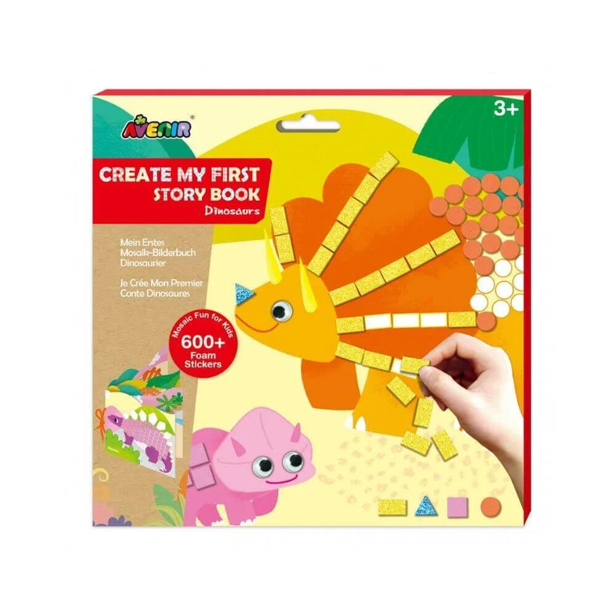 1x libro de historias de mosaico de dinosaurios, 2x plantillas de imágenes a doble cara, 1x pegatinas de espuma EVA (4 colores), 1x manual de instrucciones