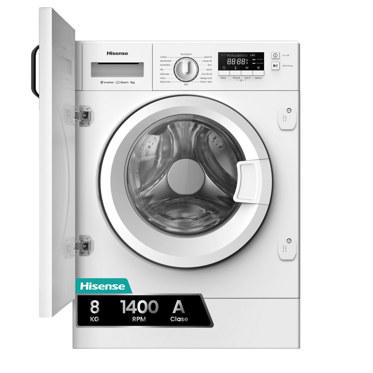 Lavadora integrable - Hisense WF3M841BWIES, 8 kg, 1400 rpm, 15 programas, Secado Allergy Care, Clase A, Sin Panelar