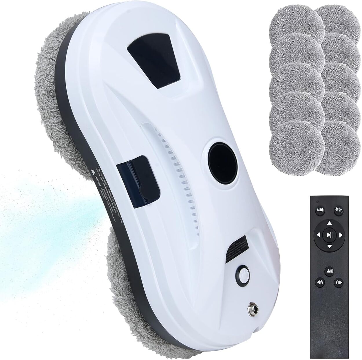Robot limpiacristales, cuerda de seguridad, mando a distancia, 4 mopas, botella dispensadora de agua, adaptador de corriente, manual de instrucciones