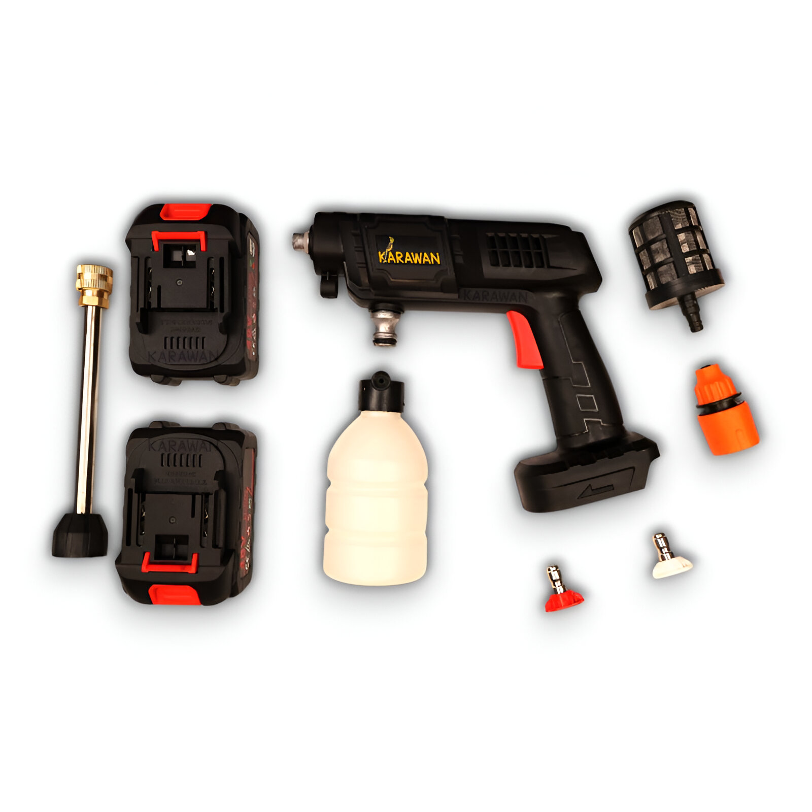 Pistola pulverizadora de acoplamiento rápido, Boquilla de ajuste rápido, Boquilla rotativa, Boquilla turbo, Manguera de alta presión de PVC de 8 m, Cable de 5 m, Filtro de agua, Aguja para limpieza de boquillas, Espumador de gran capacidad de 1 l