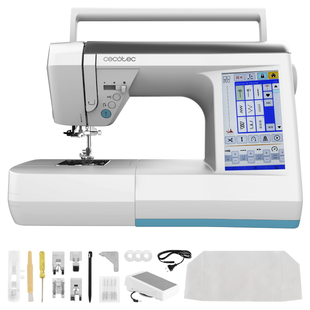 1x Máquina de coser, 1x Pedal, 1x Prensatelas para ojales, 1x Alimento para puntadas de satén,1x Prensatelas para sobrehilado,1x Prensatelas para juntas de bordes, 4x Bobinas, 1x Prensatelas para cremalleras, 1x Desgarrador, 1x Cepillo de limpieza, 1x Destornillador, 1x Destornillador en forma de T, 1x Juego de agujas, 1x Lápiz táctil para pantalla, 1x Prensatelas estándar, 1x Manual de instrucciones