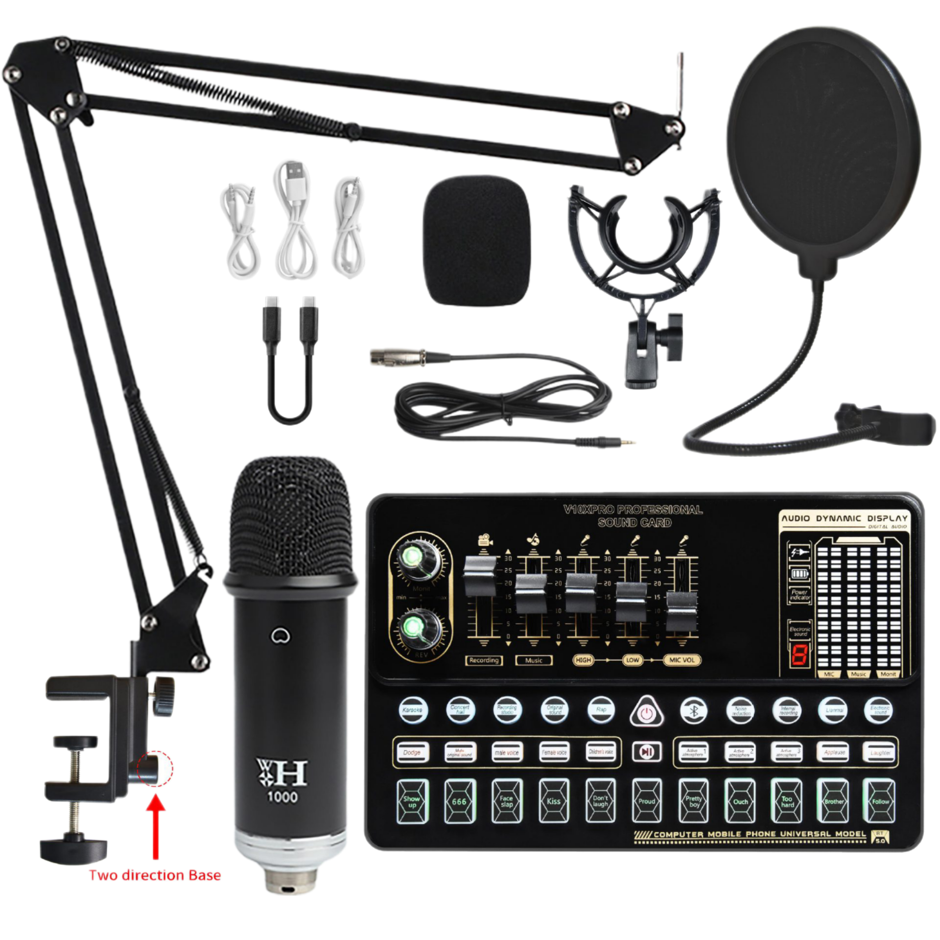 1x Micrófono, 1x Pie para escritorio, 1x Extensión elevadora, 1x Filtro antipop de espuma, 1x Cable USB 2.0