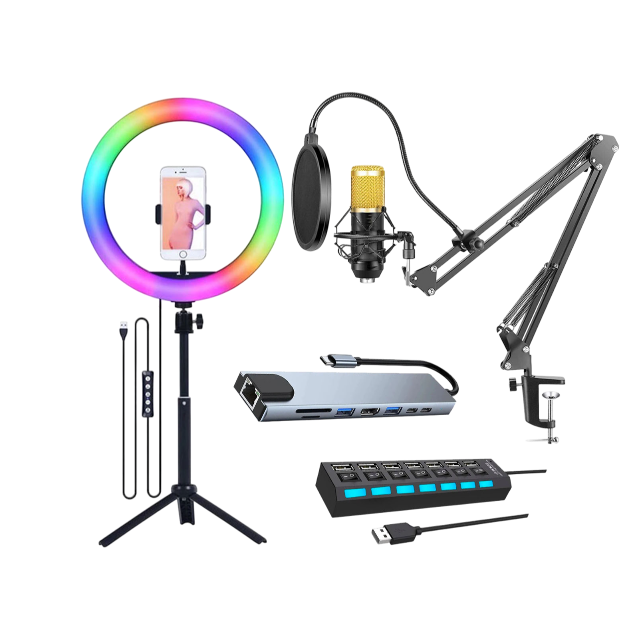 Anillo led + Hub + Micrófono condensador + Estación USB Negro