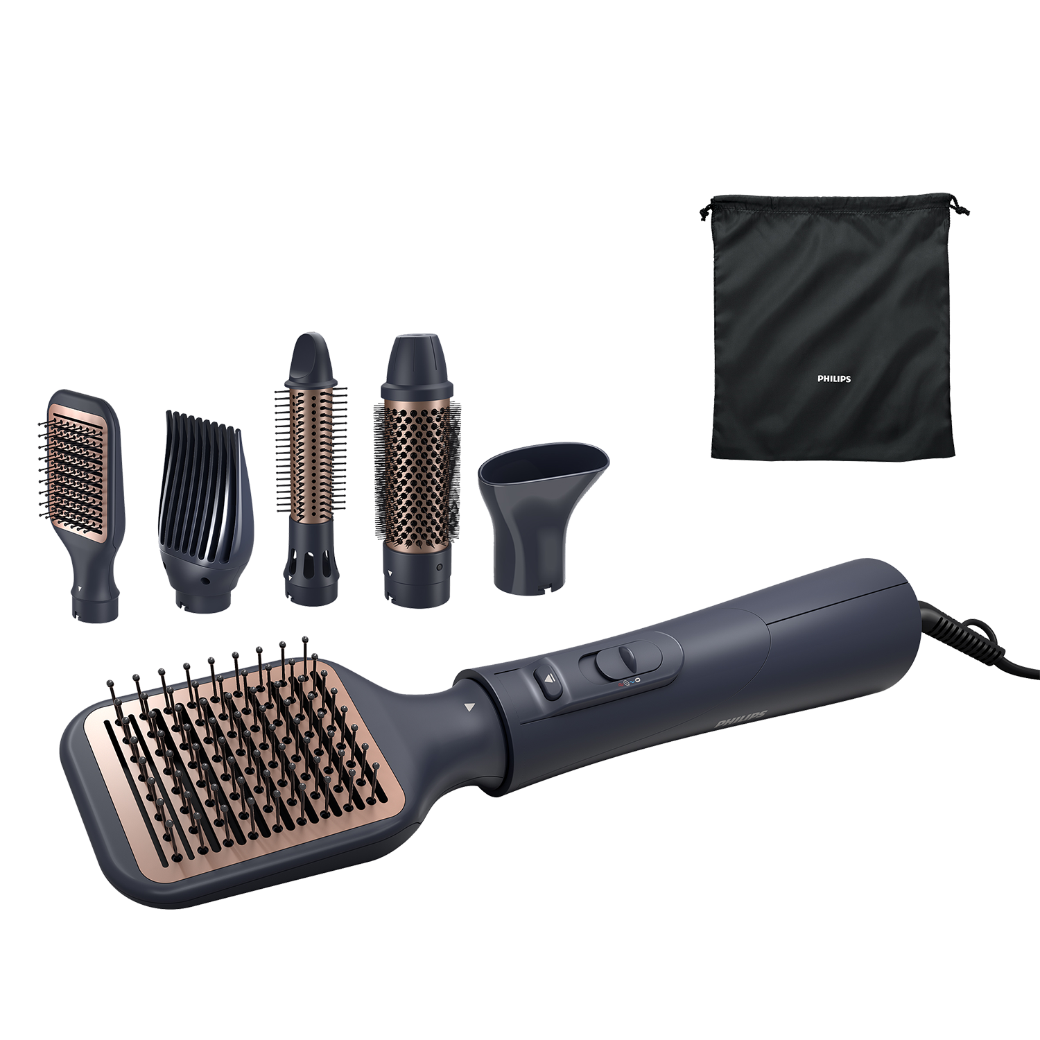 1x Moldeador cepillo de aire caliente, 1x boquilla para peinar, 1x cepillo con cerdas retráctiles, 1x cepillo para alisar, 1x cepillo para volumen, 1x cepillo térmico de 38 mm, 1x manual de instrucciones