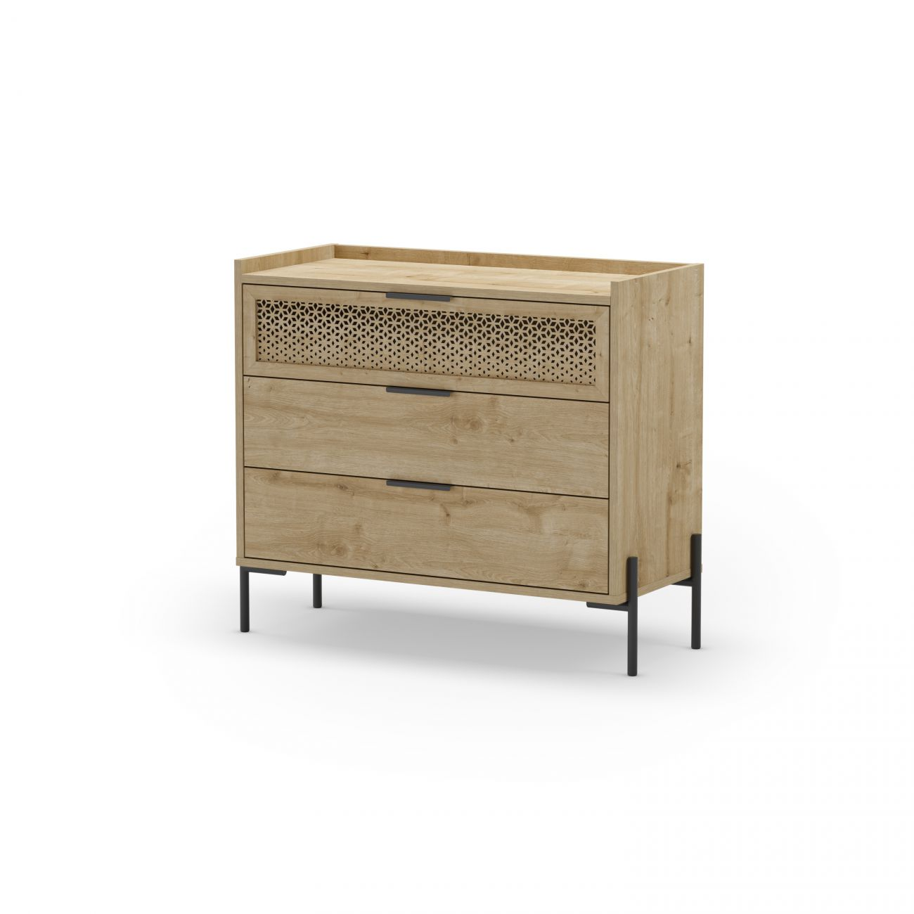 Melamina 15 mm, trasera y cajones en DM, tiradores y patas en ABS, guías metálicas
