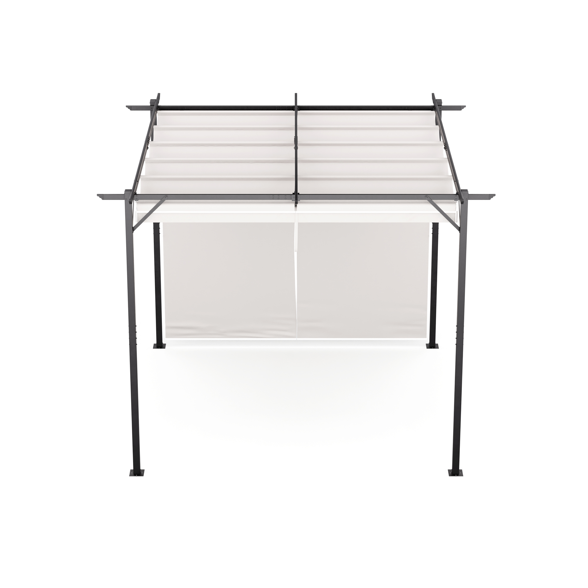 Pérgola, Techo de poliéster, Persianas enrollables laterales, Anclaje al suelo,