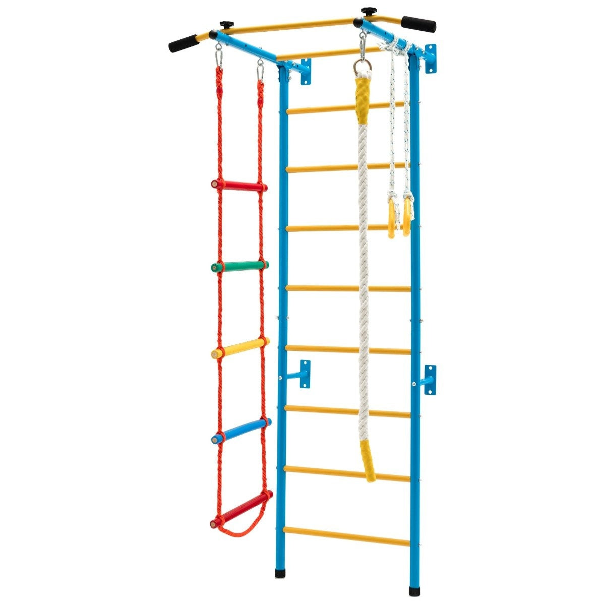 1 x escalera de pared, 1 x barra de dominadas, 1 x escalera de cuerda, 1 x cuerda para escalar, 1 x anillas de gimnasia, 1 x manual de instrucciones
