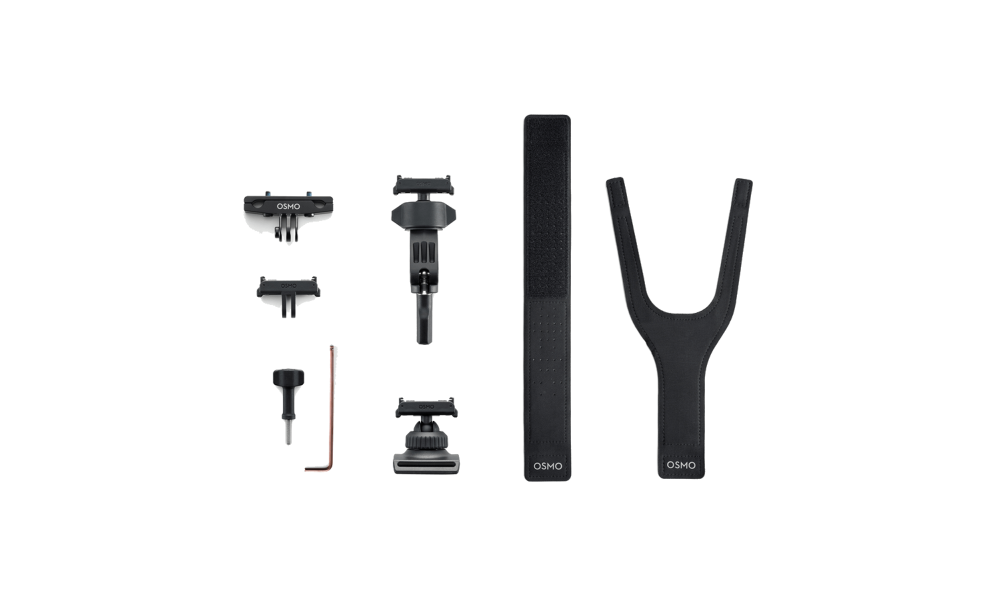 1x Kit de accesorios para ciclismo de carretera Osmo (liberación rápida bidireccional), 1x 1x soporte adaptador de liberación rápida bidireccional Osmo, 1x correa de muñeca 360° bidireccional Osmo Action, 1x minisoporte para manillar bidireccional Osmo Action, 1x soporte para raíl de sillín de bicicleta Osmo Action, 1x tornillo de fijación Osmo y 1x llave hexagonal Osmo Action