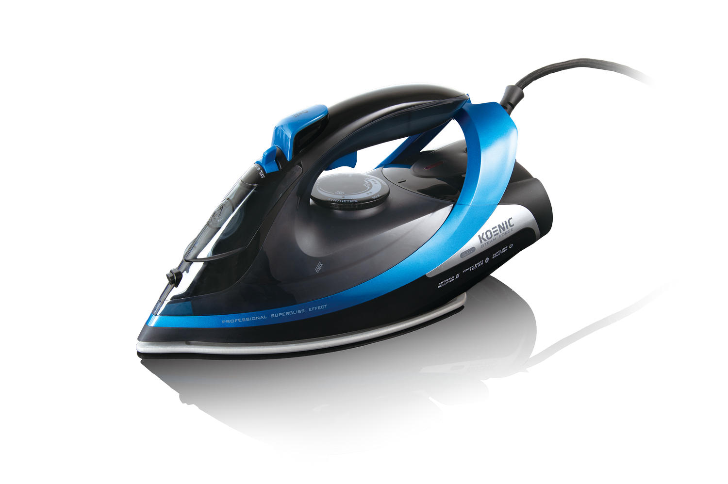 Plancha de vapor - KOENIC KSI 2625, 400 ml, 40 g/min, Sistema Antical, Negro/Azul