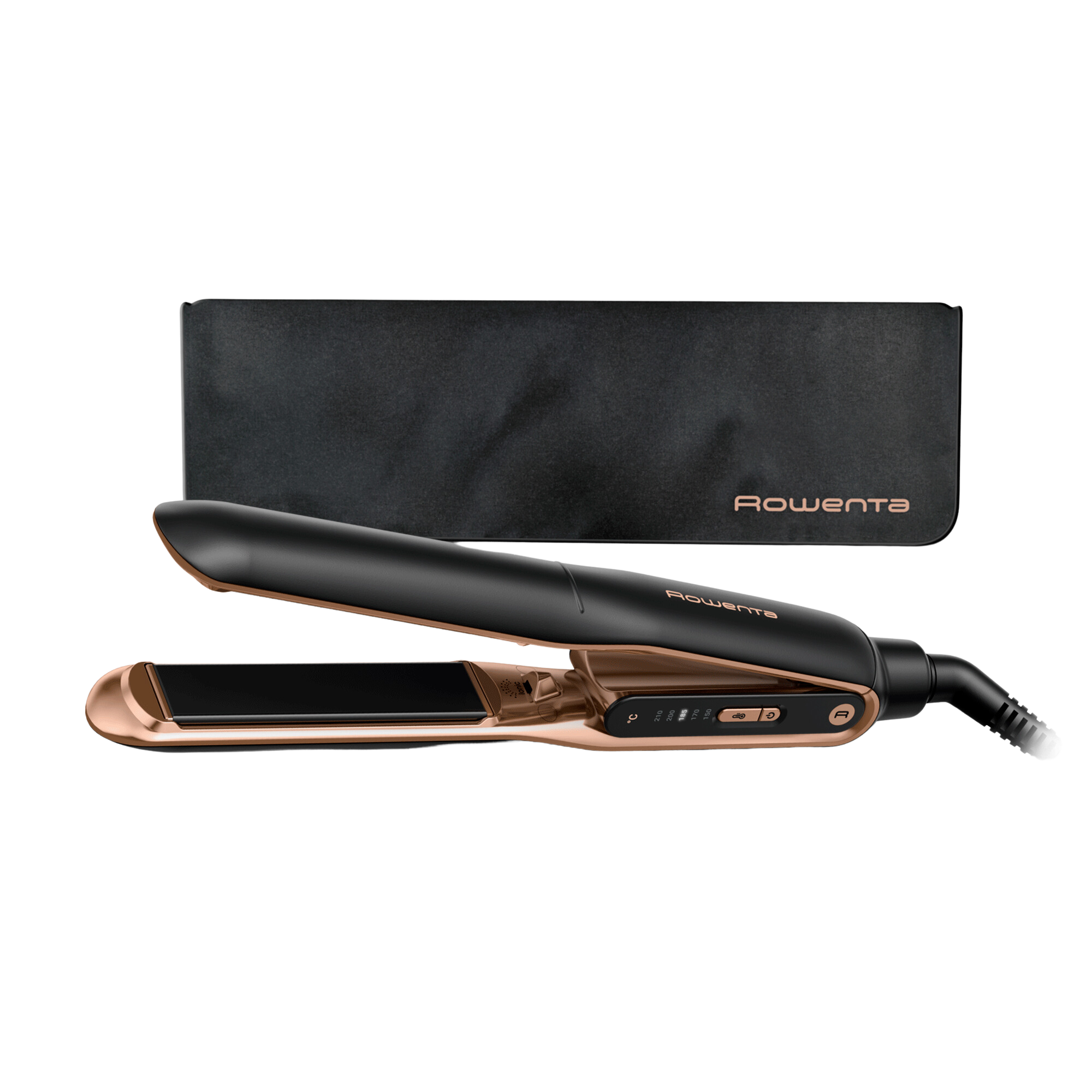 Plancha de pelo - Rowenta Ultimate Experience SF8120, Tecnología Thermocare, Revestimiento titanio, Iónica, 5 temperaturas, Panel led, Neceser, Negro