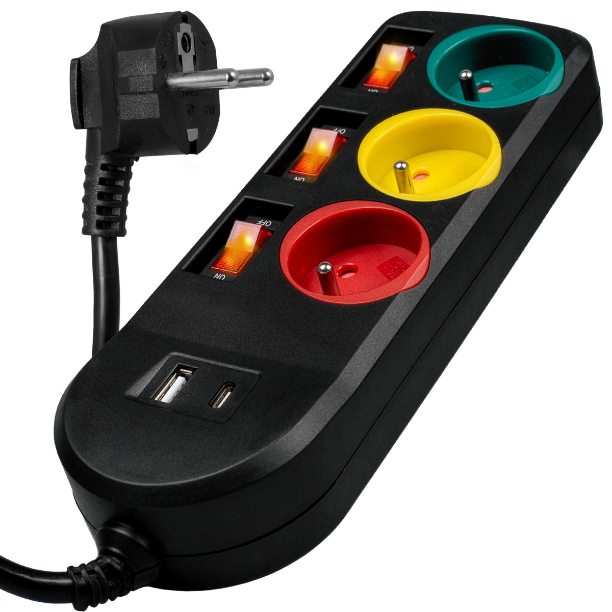 Regleta eléctrica - VA0402, 2m, 3 enchufes, 3 interruptores, USB-A, USB-C VAYOX, Negro