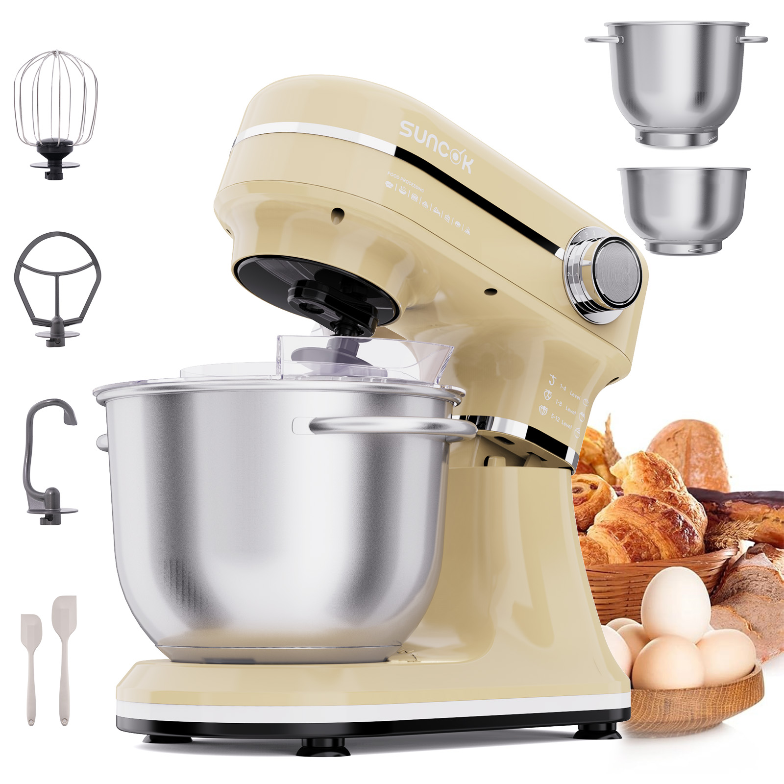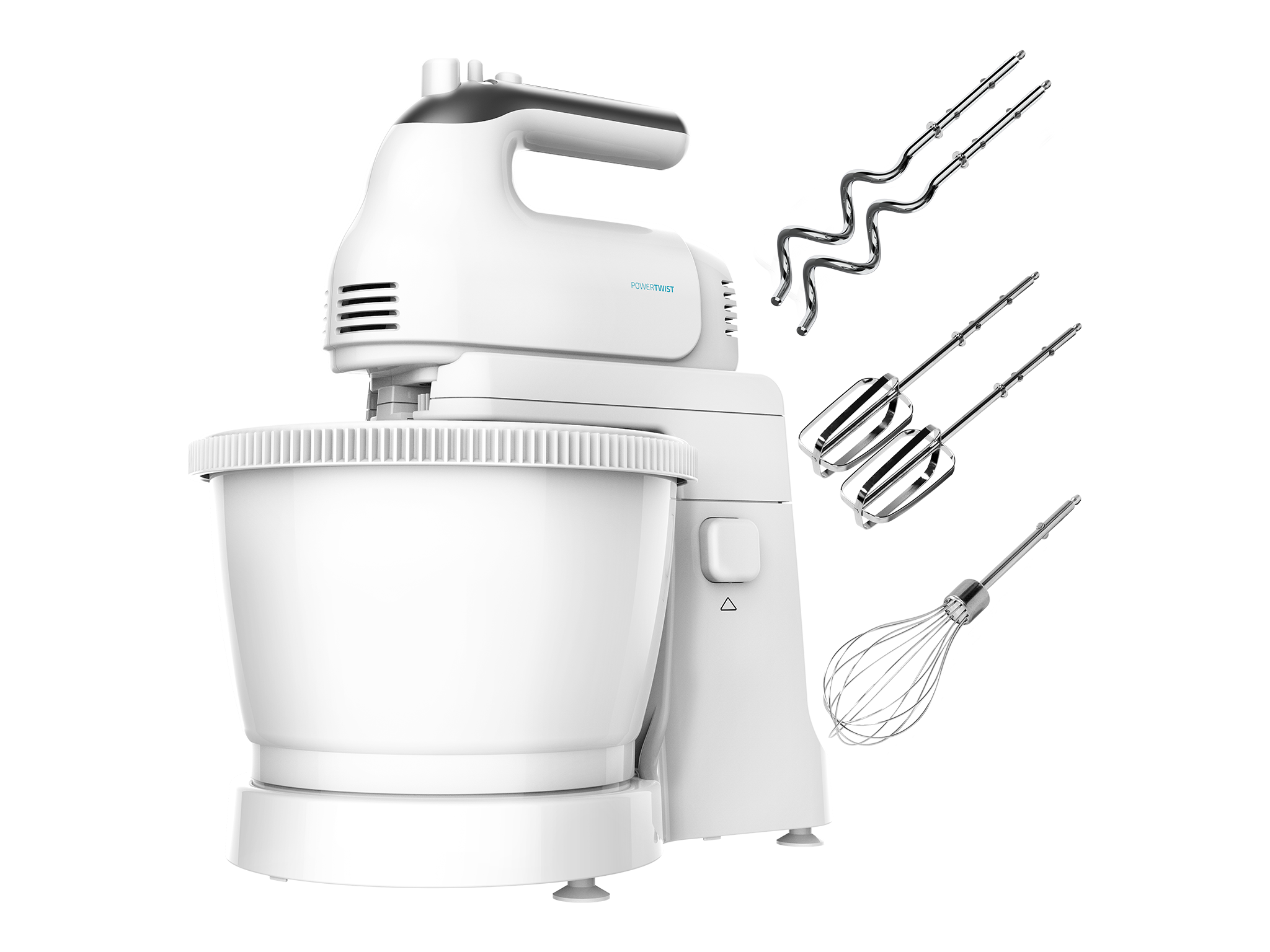 Batidora de varillas, bol de plástico, varilla de globo, dos varillas batidoras, dos garfios amasadores, espátula de repostería