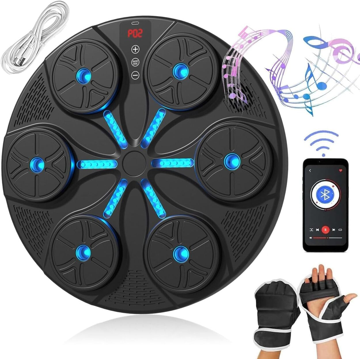 Cable de carga, boxeo musical, guantes de boxeo para adultos, manual de instrucciones, cinta autoadhesiva