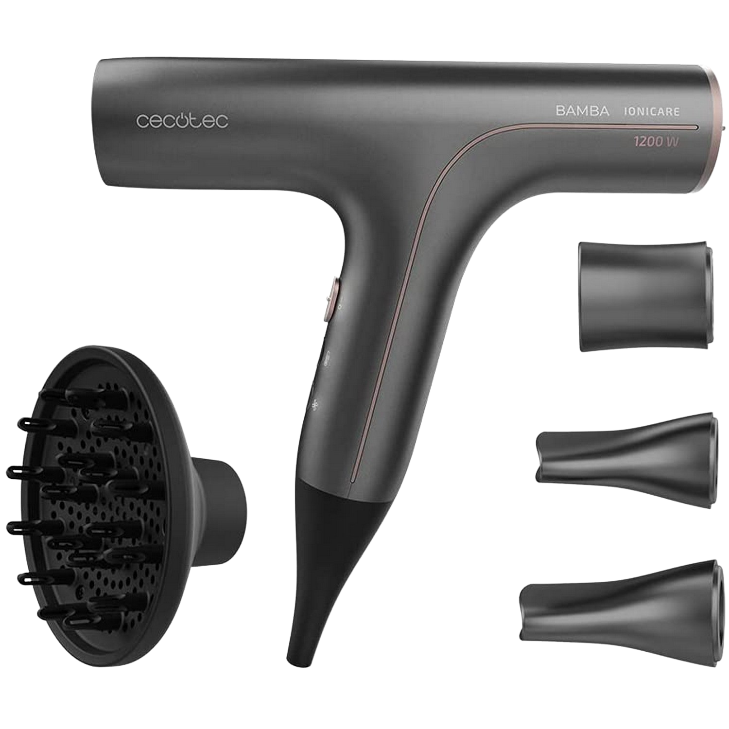 Secador - Cecotec Bamba IoniCare 6000 RockStar Soft Pro, Con Difusor,1200 W, Ionizador, 5 niveles, Gris