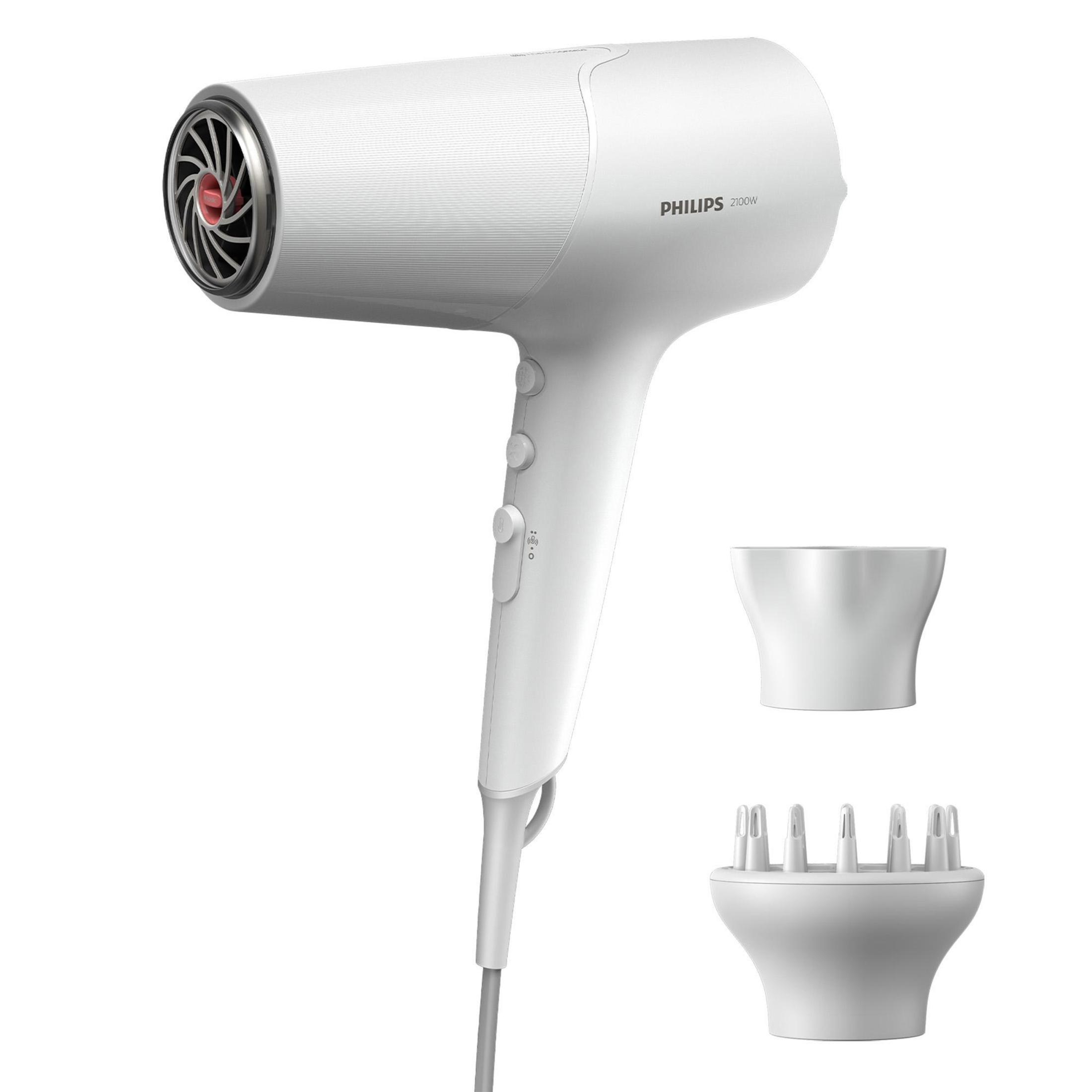 Secador de pelo iónico - PHILIPS 5000 series BHD500/20, 2100 W, 3 niveles temperatura, 6 velocidades, Difusor incluido, Blanco