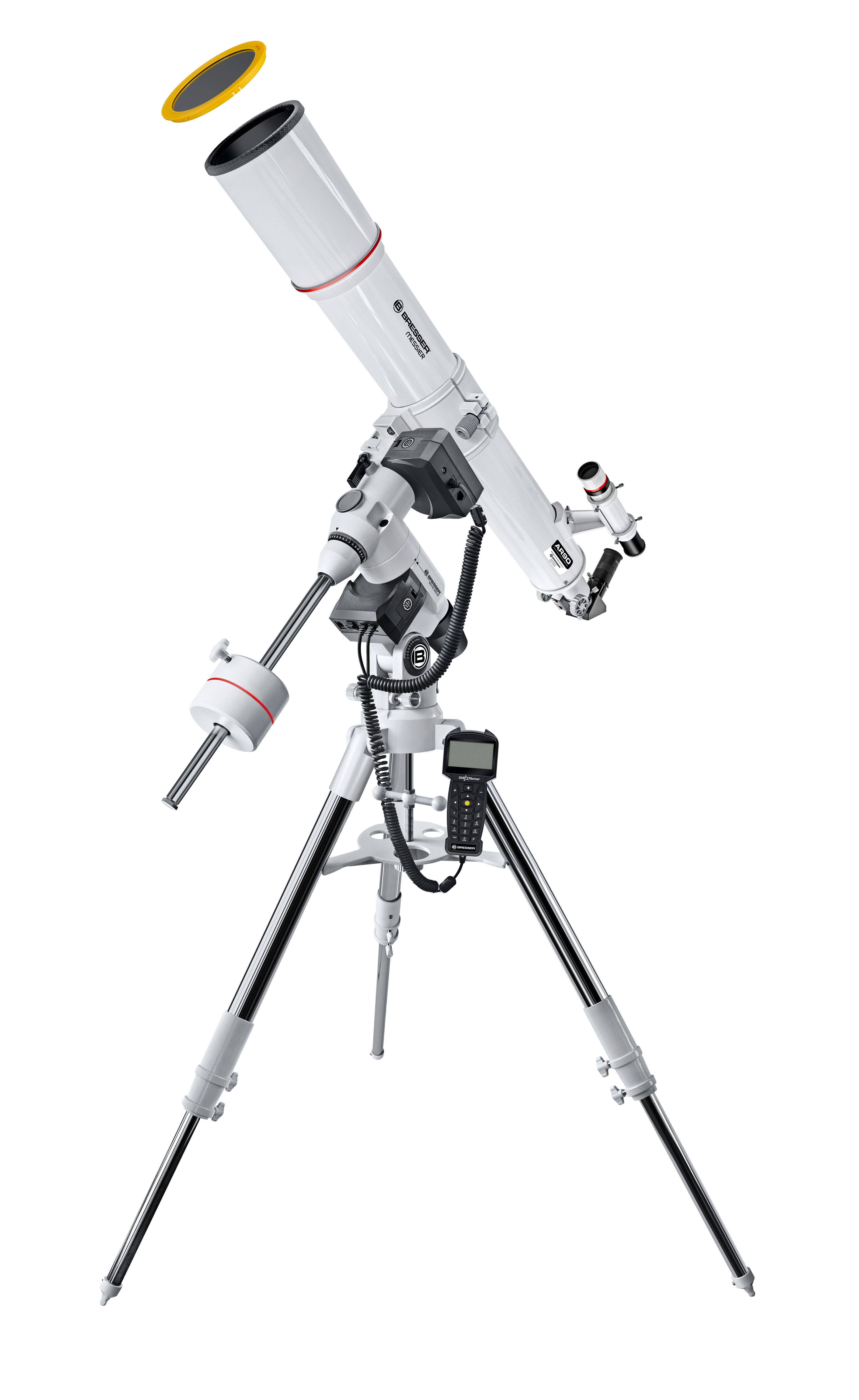 Óptica Maksutov con tubo Ocular Super Plössl de 26 mm (31,7 mm / 1,25") Adaptador de ocular SC (31,7 mm / 1,25") Espejo cenital Barra prismática para nivel GP Buscador LED Filtro solar para el objetivo Buscador polar con iluminación opcional Carta estelar giratoria Software de astronomía Stellarium para PC (descargable) Montura BRESSER EXOS-2 Trípode de campo de acero inoxidable con bandeja para accesorios 1 x contrapeso de 2 kg