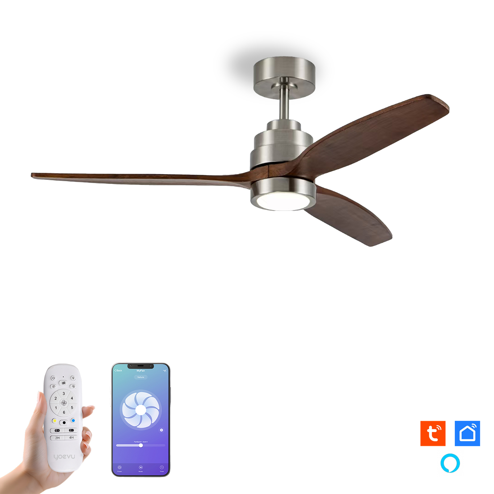 Ventilador de techo con luz LED - YOEVU HELIX, 6 velocidades, Nogal