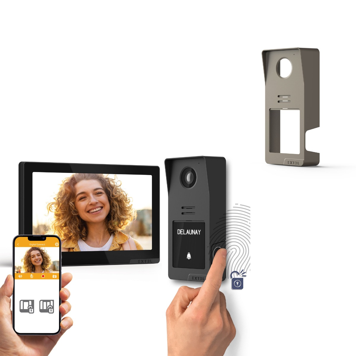 1 videoportero Digital Connect (ref. 720335) 1 monitor en color de 7'' con pantalla táctil y conexión wifi 1 pletina de calle 1 soporte de pared para monitor Herrajes de montaje 1 carcasa gris titanio para la placa de calle (ref. 720341)