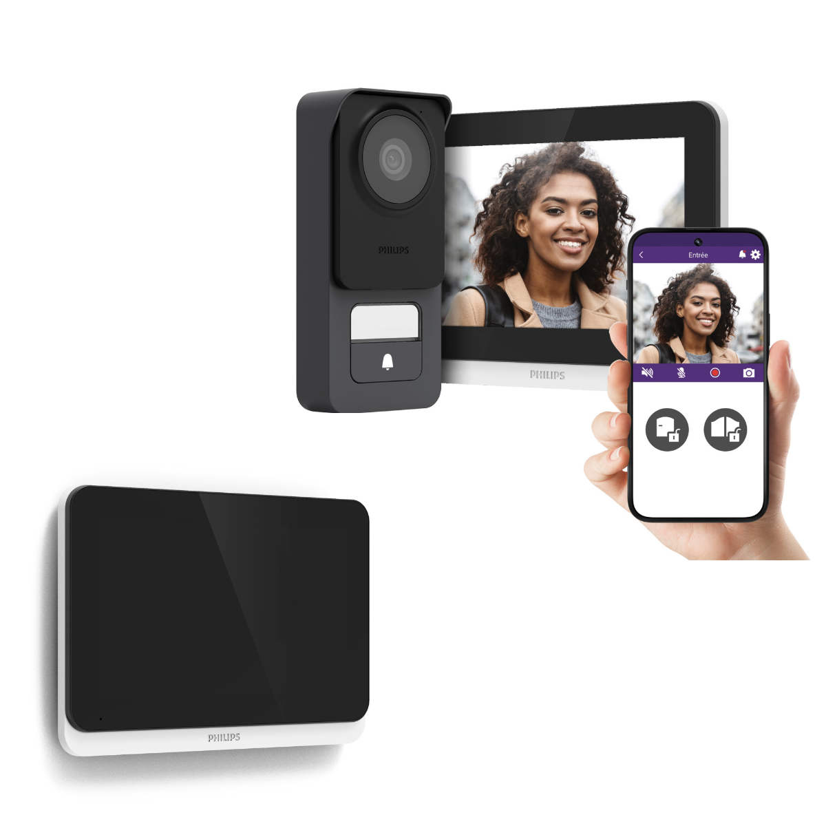 1 videoportero Philips Connect 3 (ref. 531046) ◦ 1 monitor táctil en color de 7" - Wifi ◦ 1 placa externa con opción RFID integrada ◦ 1 soporte de pared para el monitor ◦ 1 fuente de alimentación enchufable (adaptador para Reino Unido incluido) ◦ 3 llaves