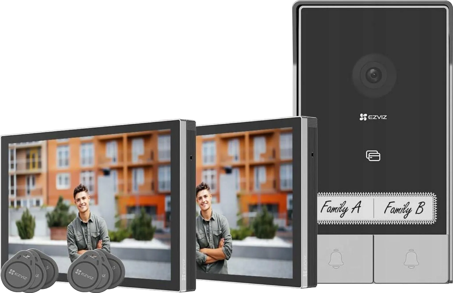2x Monitores, 2x Soporte de pared para monitor, 2x Adaptador de corriente para monitor, 2x Plantilla de perforación para monitor, 1x Panel de intercomunicación con protector resistente a la intemperie, 1x Plantilla de perforación para panel de intercomunicación, 1x Destornillador, 6x Insignias, 3x Kit de tornillos, 2x Tarjetas de identificación, 2x Cables y conectores de cables, 2x Cable conector para toma de alimentación de CCde 24V, 2x Información reglamentaria, 2x Guía de inicio rápido