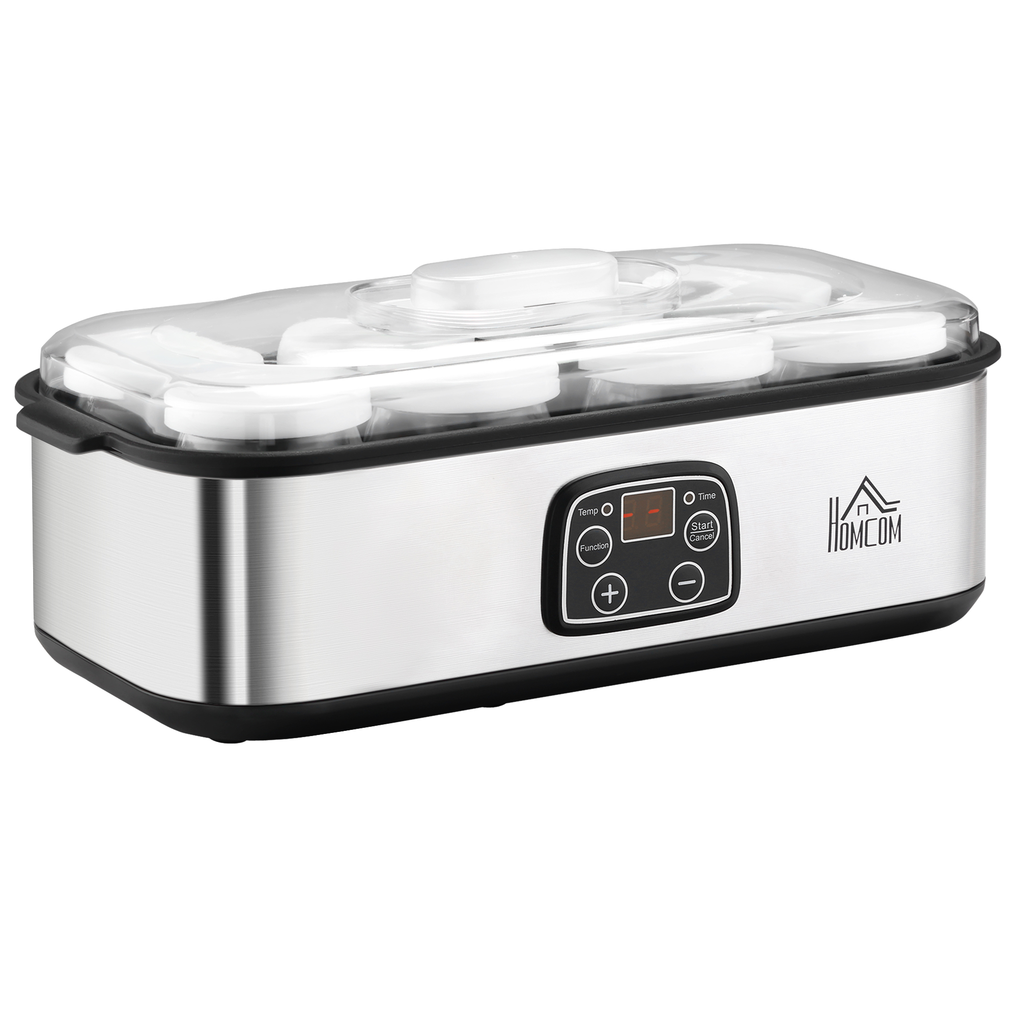 HOMCOM Yogurtera 25W Capacidad 1,44L con 8 Tarros de Cristal de 180 ml Termostato Ajustable Temporizador de 1-48 Horas y Apagado Automático 36x18,8x14 cm Plata