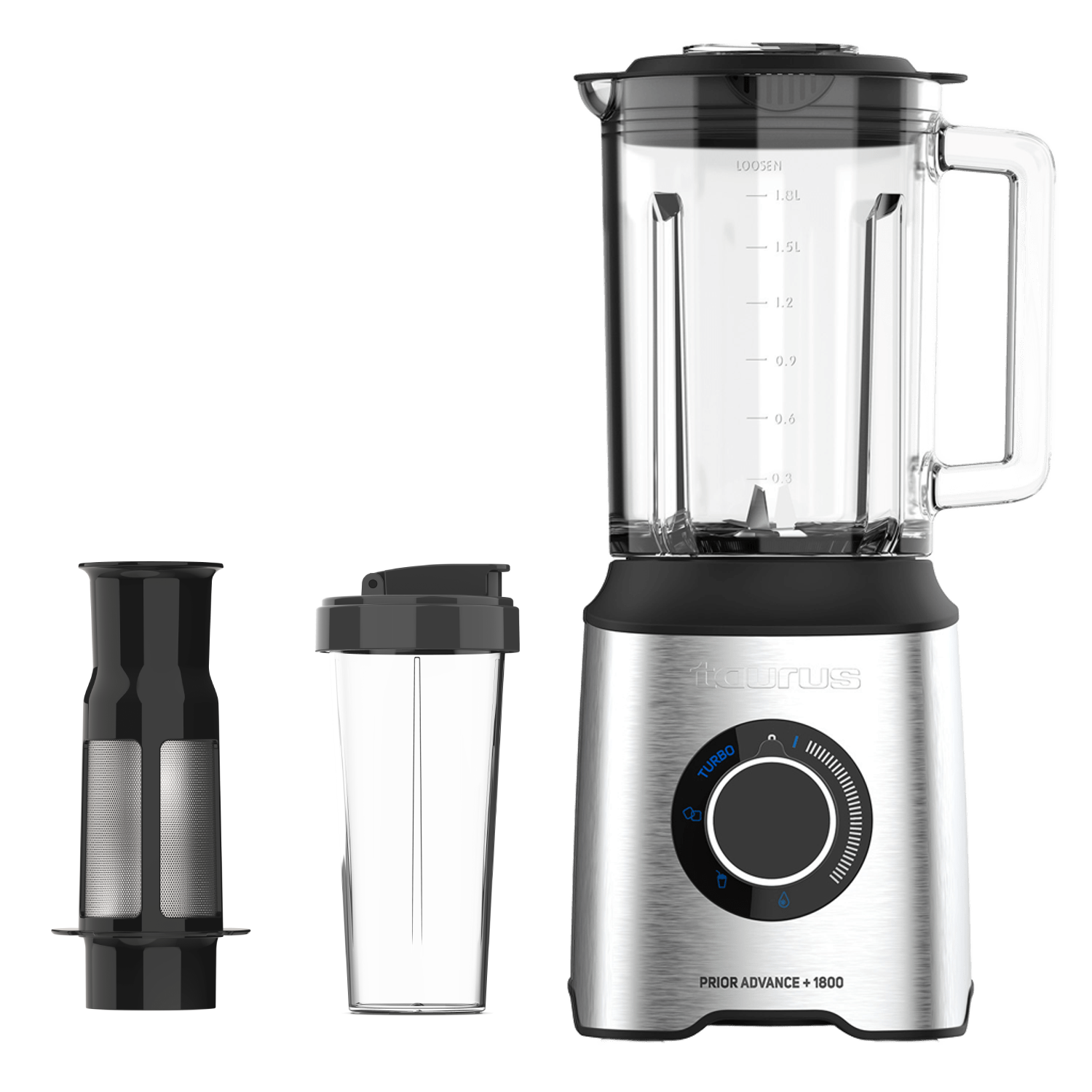 1x Batidora de vaso, 1x Jarra de cristal, 1x Filtro para pulpa, 1x Vaso portátil, 1x Vaso medidor