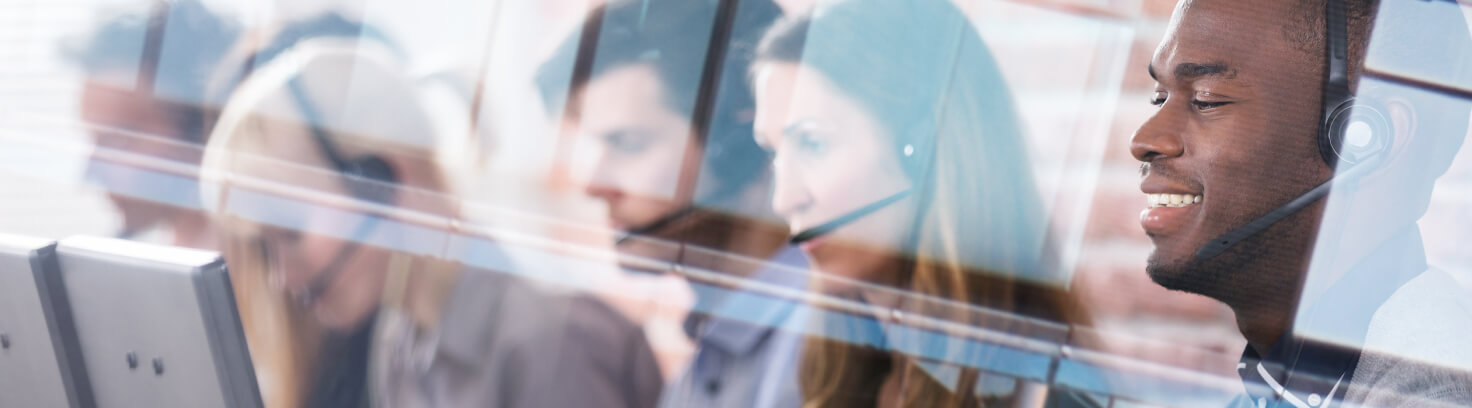 Persona con audífonos frente a un portátil, con texto "Diagnóstico y resolución en tiempo real y de manera remota". Fondo difuminado.
