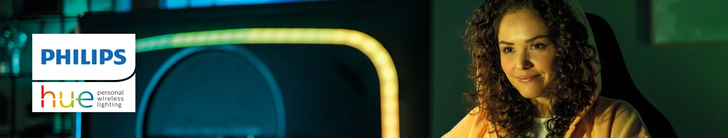 - Otro de los productos estrella de Philips Hue es la gama de entretenimiento. Philips Hue ha desarrollado todo un entorno de productos para llevar tus juegos y experiencia de Home Cinema a otro nivel. Las tiras led para TV de Philips Hue se sincronizan con el contenido de tu pantalla, reaccionando a los colores haciendo que estés dentro de la peli.